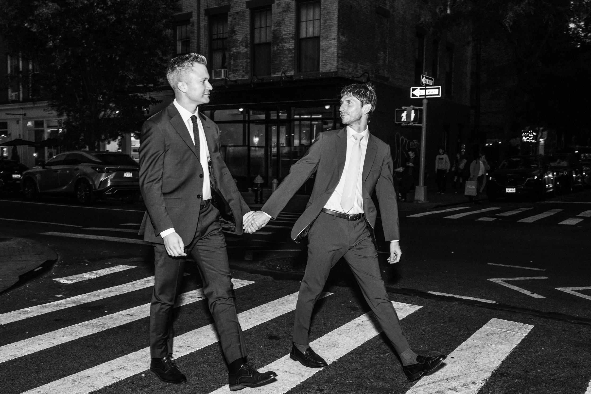 Scott and Isaac organized their own dinner in the West Village afterward and brought their Cakewalk photographer along for the ride. The night turned into a walking tour of their old life: Generation Records, where they flipped through the punk and hardcore bins in their suits. Joe's Pizza on Carmine Street. Crossing the street hand in hand with the kind of confidence that comes from having just made it official.
